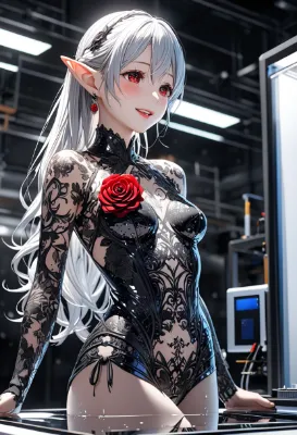 8K resolution, ((perfectly aligned fingers)),((cinematiclight,masterpiece,best quality,Ultra extremely detail everyone ,perfect anatomy,high-resolution,highres,extremely detailed,sharp focus)),((high-contrast:1.6,strong back-light, flower print)) ,((from-top:1.5,extreme zoom_up face,cute child elf wearing school-wear with sleeves and brilliant sequins, wearing very large gothic ribbon of rose,white unserwear)),((best detailed red Eyes with eyeshadow:1.5 and reflection)), (messy platinum white hair),elf ear with big red earrings ,wetting face,blush,enough lip with lipstick and wet,laugh,Skin Gloss and skin is soaking wet, wet-lip:1.5,big hip,small breasts,tatoo-art printed Skin Gloss at legs,looking at viewer front of 3D printer,BREAK,(((3D-printer))),Bubbles,BREAK,blooming white rose farm, <lora:hohoaka:1> <lora:make25d_type1_v100:1>