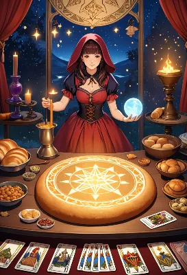 masterpiece, best quality, extremely detailed, high resolution, 8k, ultra-detailed, amazing, tarot fortune teller, witch, 1 woman, baking bread, buddy cat, tarot cards, dynamic staging, movie lighting, morning, magic, fantasy, extremely fine and beautiful design, extremely fine and beautiful colors, premium performance, illustration, <lora:saturation:0.4>