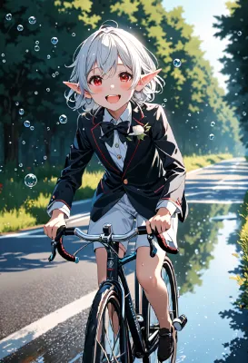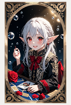8K resolution, ((perfectly aligned fingers)),((cinematiclight,masterpiece,best quality,Ultra extremely detail everyone ,perfect anatomy,high-resolution,highres,extremely detailed,sharp focus)),((high-contrast:1.6,strong back-light, flower print)) ,((from_above:1.5,extreme zoom_up face,cute child elf wearing suit with sleeves and brilliant sequins, wearing very large gothic ribbon of rose,white unserwear)),((best detailed red Eyes with eyeshadow:1.5 and reflection)), (messy platinum white hair),elf ear with big red earrings ,wetting face,blush,enough lip with lipstick and wet,laughing happily, Skin Gloss and skin is soaking wet, wet-lip:1.5,big hip,small breasts,Skin Gloss at legs,looking at viewer, sitting in tarot-card,BREAK,((tarot-card on table)),Bubbles,BREAK,blooming white rose farm, <lora:hohoaka:1> <lora:make25d_type1_v100:1>