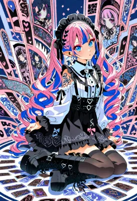 幻想的な青い薔薇の館に住むエルフのメイド少女。彼女は古いカードを手に、訪れる旅人の運命を占う。白い柱が立ち並ぶ大聖堂のような空間で、静かに座りながら、カードが語る秘密の物語を解き明かす。青い髪が揺れる中、少女の紫の瞳には、未来の冒険が映る。薔薇の香りに包まれ、彼女の日常は魔法のような瞬間で満ちている。あなたもカードを引いてみては?