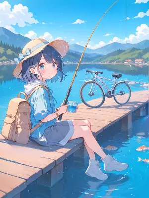girl fishing at the lake, Parked bicycle in the back, sitting on pier, Reel-equipped fishing rod, from side, Blue water surface, barefoot, smile, looking at viewer,