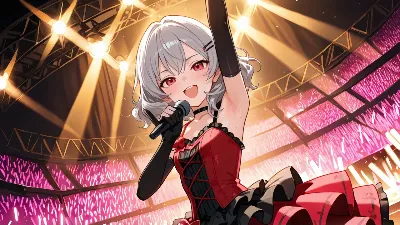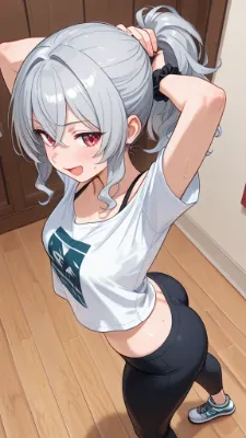 anime,best quality,extremely detailed,solo,cowboy shot,skinny tiny 1girl,flat chest,flat buttocks,thin thighs,pot belly,midriff peek,barefoot, short wavy hair,crossed bangs,silver ash grey hair,bright garnet red eyes,(v-shaped eyebrows:0.7),smile,open mouth, bra strap peek under camisole,strap slip,loose panties peek under shorts,open fly, white plain shirt,pink bra,pink panties,denim shorts,black headphones,wireless,,smile,sweat,singing,hand up,pinky out,holding microphone,wireless BREAK