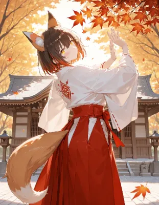 BREAK twilight shrine garden, giant glowing sun behind, fox maiden in miko robes, shackled hands raised to sky, silhouette glowing, red leaves drifting in radiant light, mystical ambience