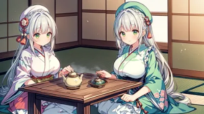 (masterpiece:1.3), (best quality:1.3), (high resolution:1.2), (intricate details:1.1), (8k:1.1), (anime style:1.3), (beautiful digital illustration:1.2), (soft, warm light:1.2), (smooth shading:1.1), (clean linework:1.0), (vibrant colors:1.0), (Two charming sisters:1.2), (beautiful long silver hair:1.1), (emerald eyes:1.1), wearing (stylish light autumn sweaters:1.2) and (long skirts:1.0), (sitting closely together:1.3) on a (wooden bench:1.2) in a (quiet park:1.2). The (sky is a beautiful gradient of orange, pink, and purple:1.3), indicating the sunset. (Long, gentle shadows are cast by the setting sun:1.1). A (few fallen leaves:1.0) are scattered on the ground. The atmosphere is (peaceful, nostalgic, and a little melancholic:1.2). They are both smiling gently, watching the sun go down.