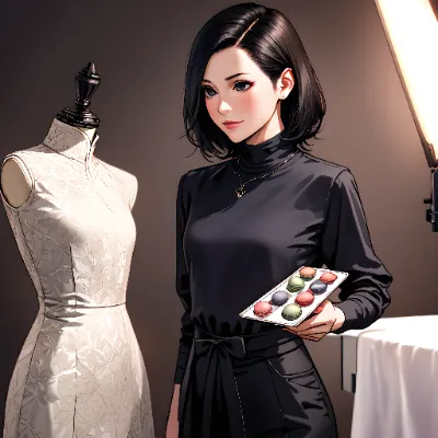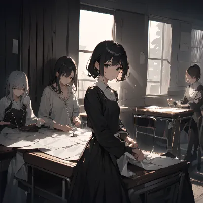 masterpiece, best quality, ultra-detailed, dramatic lighting, a strict middle-aged female fashion professor, emaciated build, flat chest, short dark hair, sharp black eyes, wearing simple monochrome clothing, sewing an autumn couture dress by hand with needle and thread, sitting alone in a dimly lit studio, piles of fabric around, intense focus, cinematic shadows, moody atmosphere, award-winning photography