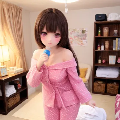 A teddy bear, a pink polka-dot bed with bed sheets and duvet, pink curtains with a “~” pattern, a black off-the-shoulder top, a girl in pink pyjamas, a Sanrio cow-shaped alarm clock, a lampshade hanging from a pale pink ceiling, storage boxes and baskets including a bookcase containing make-up tools and accessories, manga magazines with reader model covers, fashion magazines with reader model covers, books on cosmetics, books on fortune-telling, books on managing periods, a dressing table with basic skincare products on it, room fragrances and an aroma diffuser, cushions on the bed and chair, romantic indirect lighting with a bedside lamp and fairy lights decorating the wall, houseplants, dried flowers, photos and posters on the walls, an accessory stand, a bin, chargers and cables, a wardrobe for clothes, a spot for a smartphone and small moisturising and beauty creams, towels, notebooks, pens, diaries, a laptop and tablet, hangers, a favourite cup and drink, tissues, a bin, a small rug, remote controls, ultra-high-definition 4K photo prints, and a large calendar displaying the date “32nd August” placed close to where the girl sleeps as a virtual holiday. , <lora:noline:1> <lora:hairdetailer:1>,