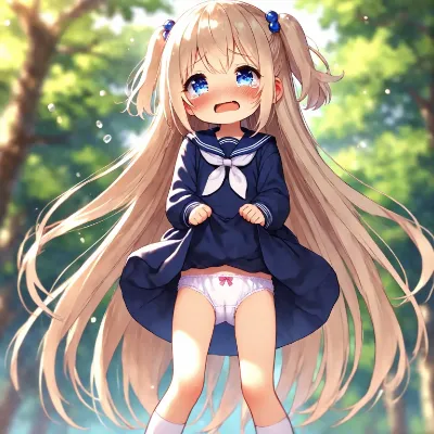 1girl, (little female child:1.2), two side up, blonde hair, absurdly long hair, very long hair, navy blue sailor dress, navy blue serafuku, navy blue sailor collar, pleated dress, smile, wind, outdoors, dynamic pose, dynamic angle, red bobbles, masterpiece, best quality