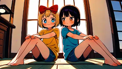 2girls,(hair bow:1.4),red bow,blonde girl with (blue eyes:1.2),short hair,bob hair,black hair girl with short hair,brown eyes,small girls,loli,happy expression,excited face,cheerful smile,flat chest,(ninja costume:1.3),black ninja outfit,dark clothing,ninja headband,mask around neck,ninja accessories,cosplay,playful pose,jumping pose,raised arms,victory pose,full body,standing position,outdoor background,training ground,japanese garden,stone path,bamboo fence,natural lighting,afternoon sun,detailed fabric,anime style,(masterpiece:1.4),(best quality:1.3),(very aesthetic:1.2),(absurdres:1.1),