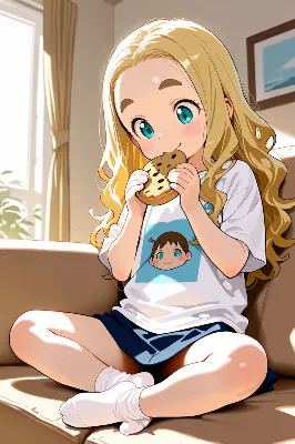 masterpiece,best quality,extremely detailed,1 elementary school girl,10 years old,black hair,medium hair,black eyes,round face,white t-shirt,denim_shorts,socks,slippers,Oven mitt,standing,smile,kitchen,(cowboy_shot:1.2),She is holding an oven tray with cookie dough cut into shapes.,