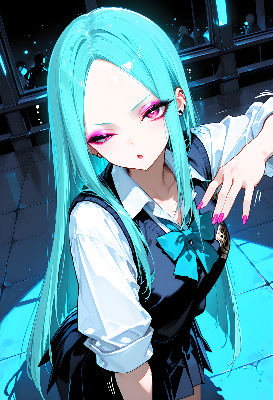 masterpiece, ultra high quality, high resolution, 4k, 8k, insanely detailed, anime style, solo focus, 1girl, gyaru, long straight hair, aqua hair, forehead, school uniform, half closed eye, cheeky gaze, eyeshadow, chestnut mouth, listening music, smart speaker, musical note, eighth note, movement motion lines:1.2, sense of depth, dutch angles, convenient angles, lighting, shadow, high-contrast, insanely detailed background