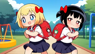2girls,(loli:1.2),cute children,elementary school age,first girl ,blond hair,short hair,bob hair,blue eyes,(hair bow:1.4),red bow,excited expression,bright smile,second girl black hair,short hair,cheerful expression,happy smile,both wearing casual clothes,colorful shirts,cute skirts,standing pose,one girl pointing at keychain,other girl holding small keychain up to examine,arms reaching toward display,legs standing naturally,feet positioned comfortably,inside keychain shop,store interior,display cases filled with keychains,colorful merchandise hanging on walls,various character keychains,cute animal designs,sparkly accessories,bright store lighting,shelves full of small items,shopping atmosphere,detailed keychain displays,metallic shine on accessories,vibrant colors everywhere,anime style,cel shading,warm indoor lighting,friendship scene,joyful shopping moment,(masterpiece:1.3),(best quality:1.3),(very aesthetic:1.2),(absurdres:1.1),