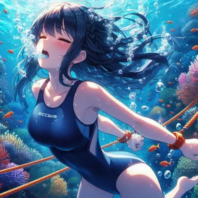 Detailed anime-style image of a girl swimming upwards towards the sea surface, wearing a blue and white bikini with floral pattern and a hip frill. Her long hair flows elegantly behind her in the water, and her expression conveys peace and wonder. The underwater scene is vibrant and colorful, filled with marine life like fish and corals. The perspective captures the beauty of the underwater environment in a wide format. Best Quality.