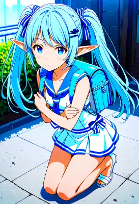 青い髪をなびかせ、エルフの少女がビーチに立つ。セーラー服のスカートを軽くつかみ、波打ち際に足を浸す彼女の瞳には、遠い海の冒険への憧れが映る。日常の喧騒を離れ、潮風に包まれながら、失われた宝を探す旅の始まりを感じさせる瞬間。彼女の耳が風にそよぎ、ファンタジーの世界が現実と交差するような、夢のような夏のひととき。