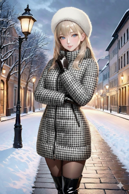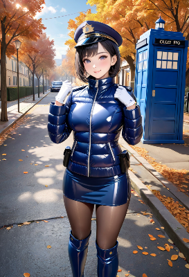 (photorealistic:1.4), (RAW photo), masterpiece, best quality, extremely detailed, lady, neat and clean, elegant, polite, (shy:0.9), black long hair, almond eyes, (smile:0.9), slim fit, (white shirt), (shiny dark blue ribbon bow tie), closed zipper, (shiny navy puffer life vest:1.3), pleated skirt, (platform long rubber boots), standing pose, (high angle shot:0.6), quiet residential area, street trees, good view, cold autumn evening