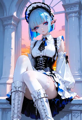 青い髪をなびかせたエルフの少女、エルナは人間の学校に通う毎日を送る。赤いランドセルを背負い、放課後の路地でしゃがみ込む彼女。何か小さな発見をしたのか、それとも異世界からの秘密を隠しているのか。好奇心に満ちた瞳が、日常の冒険を予感させる。彼女の周りでは、風が優しく囁き、未知の物語が始まろうとしている。