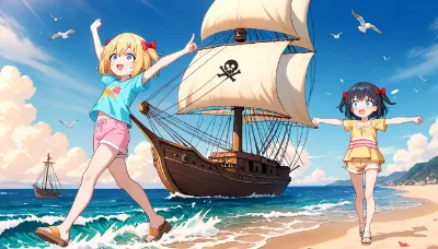 2girls,(loli:1.2),cute children,elementary school age,sneakers,first girl blond hair,short hair,bob hair,blue eyes,(hair bow:1.4),red bow,amazed expression,wide eyes,second girl black hair,short hair,curious expression,excited face,both wearing casual clothes,colorful shirts,cute shorts,standing pose,looking upward,heads tilted back,necks craned up,arms at sides,one girl pointing upward,legs standing firmly,feet planted on ground,pirate statue towering above,large bronze statue,detailed pirate figure,captain with tricorn hat,coat flowing,sword at side,ship wheel in hand,statue on tall pedestal,stone base with inscriptions,outdoor plaza setting,paved ground,historical monument area,blue sky background,white clouds,sunny day lighting,dramatic low angle view,impressive scale difference,adventure atmosphere,sense of wonder,anime style,cel shading,bright outdoor lighting,heroic statue scene,(masterpiece:1.3),(best quality:1.3),(very aesthetic:1.2),(absurdres:1.1),