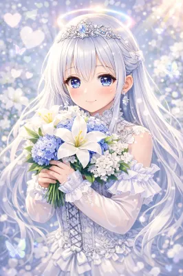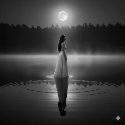 霧に包まれた夜の湖畔で、白いドレスをまとった女性が静かに佇む。彼女の手から零れ落ちる光の粒子は、失われた恋人へのメッセージか。星空の下、森の影が囁くように揺れる中、彼女は永遠の約束を胸に、湖の鏡面に自身の影を映す。やがて訪れる夜明けは、新たな物語の始まりを告げるのだろうか。読み手は彼女の過去と未来を想像せずにはいられない。