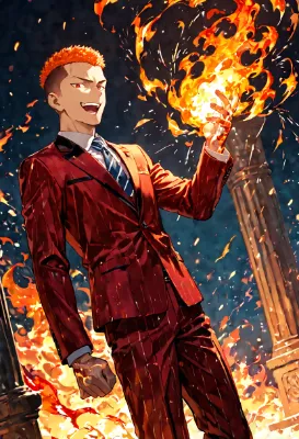 (masterpiece), (best quality), (extremely detailed), (high resolution), (beautiful face), cowboy shot , ((no hat:1.3)), Japanese anime, (((1male))), (solo:1.5), BREAK ((silver hair:1.3)), (short hair:1.3), (single braid), (purple eyes:1.3), BREAK(male face, male eyes), half-closed eyes, (tsurime, with eyelashes), (beautiful detailed eyes:1.2), BREAK (facial muscle), (larynx), (baby face), (glaring), 17 -year-old ,178cm tall, (Slightly Muscular), (flat chest), original character, fantasy, BREAK (battlefield background:1.3), (beautiful fingers:1.3), (dynamic angle:1.3), (dynamic pose:1.3), (floating dark magic:1.4), BREAK (leather, Red chinese clothes:1.5), (black long pants:1.2), (white clothes around waist:1.2), BREAK medium shot, shoot from front, looking at viewer