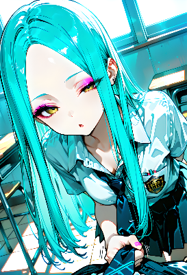 anime style, masterpiece, ultra high quality, high resolution, 4k, 8k, insanely detailed background, movement motion lines:1.2, sense of depth, dutch angles, convenient angles, solo focus, soft indoor lighting, shadow, high-contrast, 1girl, gyaru, lip, half closed eye, aqua hair, long straight hair, forehead, school uniform, eyeshadow, cheeky gaze, chestnut mouth, blush sticker,