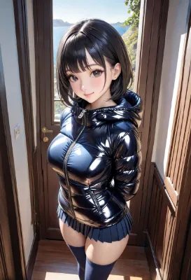 (photorealistic:1.4), (RAW photo), masterpiece, best quality, extremely detailed, lady, neat and clean, elegant, polite, (shy:0.9), black long hair, almond eyes, (smile:0.9), slim fit, closed zipper, (shiny black enamel rubber short puffer down jacket), black tight skirt, (white sailor collar:1.3), white leather gloves, (white thigh high boots), sit on small stool, (playing the grand piano), (high angle shot:0.6), bright wooden hall, (many audience seats in the background:1.2)