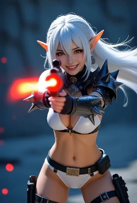 穏やかな田園風景に突如現れた巨大ドラゴン。銀髪のツインテールを持つ勇敢な戦士少女が、赤いレーザー銃を構えて立ち向かう。彼女の瞳には、故郷を守る決意が宿る。ドラゴンの咆哮が空を震わせ、水しぶきが舞う中、少女の冒険が始まる。果たして彼女は伝説の獣を倒し、平和を取り戻せるのか? 想像力を掻き立てるファンタジーの一場面。