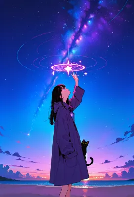 masterpiece, ultra-detailed, high quality, 8k resolution, hyper-realistic, a wizard woman floating in the air (1.2), giving off shining magic (1.1), magical circles in the background (1.0), sparkling sparks in the background (0.9), long walking stick (0.8), detailed robe with sacred geometry patterns flowing in the wind (1.0), expression of unwavering concentration and determination (1.1), dramatic lighting effects (1.0), vivid and fantastic aura wrapping around the character (0.9), flying in starry skies background (0.8), experimental composition (0.7), slight shadows around the eyes for depth (0.6), blue and orange as accent colors (0.7), extremely detailed textures, intricate details, high resolution rendering, magic circle details, <lora:saturation:1>