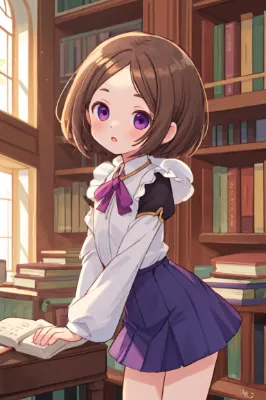 masterpiece, best quality, extremely detailed, anime, girl, , bobcut, brown hair, purple eyes, (loli face:1.2), ((dark background)), ,mini skirt,library,smile <lora:flat2:0.55> <lora:hairdetailer:0>,zettai ryouiki
