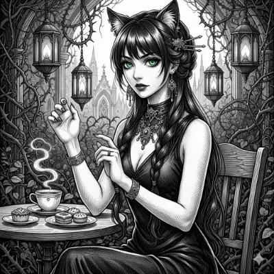 街の喧騒を離れた陽だまりのカフェで、黒髪の猫耳少女が優雅に座る。緑の瞳を輝かせ、指先でケーキをつまみながら微笑む彼女。日常の合間に訪れたこの瞬間、どんな冒険が待っているのだろうか。風に揺れるランプの灯りが、彼女の秘密めいた物語を優しく照らす。読み手は彼女の視線に引き込まれ、甘い香りとともに想像を広げる。