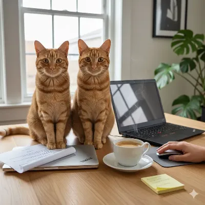 朝の陽光が差し込む部屋で、二匹の猫がリモートワークの現場を占拠。ベッドにくつろぐ一匹は夢の世界へ旅立ち、デスクの傍らで眠たげに目を細めるもう一匹。飼い主の仕事は彼らの気まぐれな冒険に邪魔されながらも、穏やかな日常が続く。ふとした瞬間に、彼らの好奇心が新たな物語を生むかもしれない。