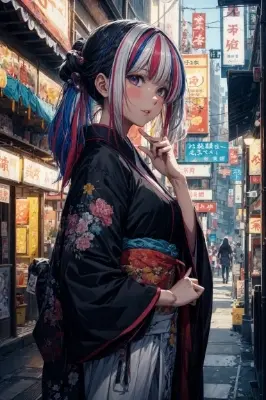 absurdres, highres, ultra detailed, (1girl:1.0), adult, depth of field, detailed, Japan, Kyoto, Traditional Cities, night, Traditional Japanese Festivals, (colorful world:1.4, colorful:1.5, colorful cloths:1.2, neon colors hair:1.6, multicolored hair, neon colors cloths:1.6)