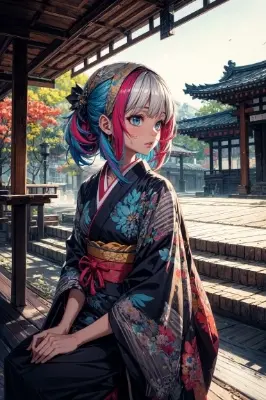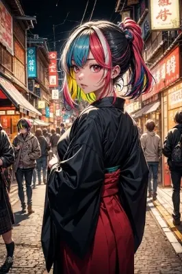 absurdres, highres, ultra detailed, (1girl:1.0), adult, 25 years old , depth of field, detailed, detailed background, (colorful:1.3, colorful cloths:1.5, streaked hair:1.2, colored inner hair:1.2, neon colors hair:1.4), (Kyoto),