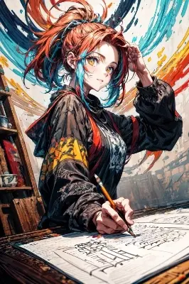 , (streaked hair:1.2, colored inner hair:1.2, neon colors hair:1.4, crown braid hair), (1girl:1.3), adult, 25 years old, <lora:2vXpSwA7_flat2:-1>, (colorful cloths:1.5, sense of movement), from above, hand on headwear