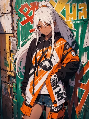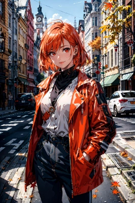 , (streaked hair:1.2, colored inner hair:1.2, neon colors hair:1.4, wavy bob hair), (1girl:1.3), adult, 25 years old, (colorful cloths:1.5, sense of movement), profile, hand on hip