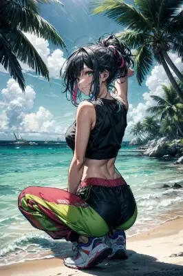 , (streaked hair:1.2, colored inner hair:1.2, neon colors hair:1.4, ponytail hair), (1girl:1.3), adult, (colorful cloths:1.5, sense of movement), profile, arms behind head