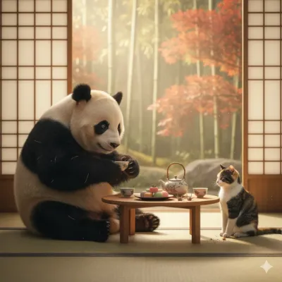 広大な山岳地帯をゆくパンダの背に、勇敢な猫が乗って進む。夕陽が空を橙色に染め、二人を優しく照らす。これは、意外な友情が生んだ冒険の瞬間。パンダの力強い足取りと猫の好奇心あふれる視線が、未知の頂を目指す。花々が咲く道中で、どんな出会いが待っているのか? 二人の絆が試される旅路は、読み手の心をわくわくさせる。