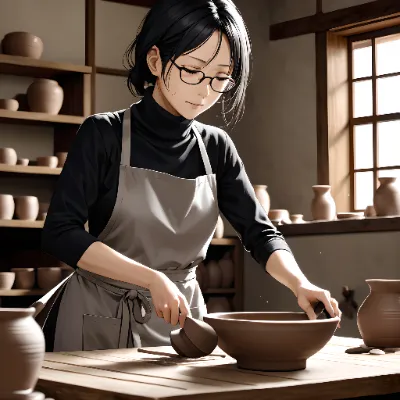 a slender Japanese college girl, age 20, with black bob cut hair and black eyes, wearing a loose beige linen shirt with rolled-up sleeves, and a long indigo apron stained with clay, sitting by a potter's wheel, hands covered in wet clay, concentrating on shaping a ceramic bowl, warm expression, pottery tools around, shelves of clay works in the background, sunbeams filtering through dusty window, side profile, calm and creative mood --v 5 --ar 3:2 --style photographic
