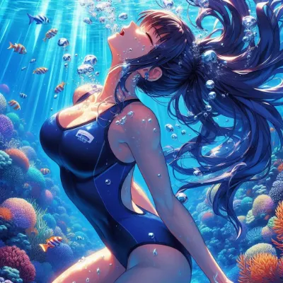 Detailed anime-style image of a girl of Asian descent unable to hold her breath while swimming at the bottom of the Coral Sea. She is wearing a sleek competitive sleeveless pink swimsuit and has flowing hair with high ponytail. She appears to be exhaling or struggling underwater, with many bubbles escaping from her mouth. The underwater scene is filled with vibrant light patterns from the sun, colorful fish. She closes eyes.She is completely upside down Best Quality