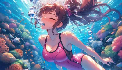 Create an anime-style image of a girl swimming in a coral reef, making a heart symbol with her hands. She should have a gentle and relaxed expression, with her high ponytail hair flowing around her in the water. The two-piece swimsuit should have a rainbow, floral pattern, with realistic light reflections that suggest movement and depth. The underwater view should show a clear blue pool with light patterns reflected on the bottom of coral reef. Best Quality.