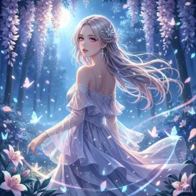 幻想の宮殿で、白髪の姫が輝く星を優しく手に取る。吊り下げられたランプの光がクリスタルを照らし、泡のような粒子が舞う中、彼女は願いを込めて空を見上げる。この瞬間、失われた魔法が蘇り、冒険の扉が開く。姫の瞳に映る星は、未来への希望か、それとも隠された秘密か? 読み手は彼女の物語を想像し、自身の夢を重ねるだろう。