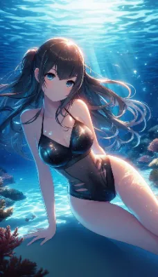 Create an anime-style image of a girl swimming in a coral reef, making a heart symbol with her hands. She should have a gentle and relaxed expression, with her high ponytail hair flowing around her in the water. The two-piece swimsuit should have a vivid orange, floral pattern, with realistic light reflections that suggest movement and depth. The underwater view should show a clear blue pool with light patterns reflected on the bottom of coral reef. Best Quality.