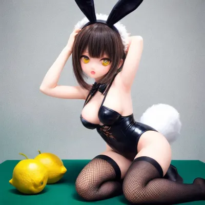Today's Solaris outfit is a vitamin-coloured, ultra-high-leg bunny girl look themed around lemons. I'm wearing a large black ribbon on my head, and my straight black hair is styled with crescent-shaped bangs to show off a broad forehead. The outfit features a vivid lemon-yellow leotard with a plunging neckline and a high-leg design that accentuates the derrière. The entire leotard is dotted with a pop pattern of sliced lemons, creating a wonderfully juicy vibe. And my special touch? I've attached futuristic metallic lemon slice-shaped parts around the high-cut section like a belt. On my ears, I wear a rabbit ear headband, and in my hand, I hold a fresh, juicy lemon dripping with juice!