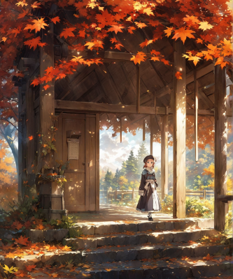 Please turn this picture of a pure young lady looking at autumn leaves and thinking that winter is approaching into an anime style.