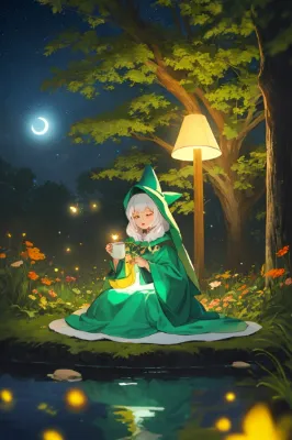 深い森の奥、満月の光が差し込む中、小さな魔女が黄金の光球を優しく手に取る。彼女は古の魔法の守護者で、この光は失われた宝の鍵。キノコの妖精たちが周りを舞い、冒険の予感が漂う。果たして彼女は森の謎を解き明かし、隠された世界への扉を開くのか? 幻想的な夜の物語が今、始まる。