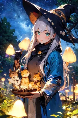 深い森の奥、月明かりに照らされた小川のほとりで、緑のローブをまとった白髪の魔女が座る。キノコの優しい光とホタルの舞う中で、彼女は魔法のハーブティーを静かに味わう。日常の喧騒から離れ、星々のささやきに耳を傾けるこの瞬間は、彼女の冒険の合間の安らぎ。どんな秘密の物語が、このティーカップに溶け込んでいるのだろうか? 夜風が運ぶ花の香りに、想像が広がる。