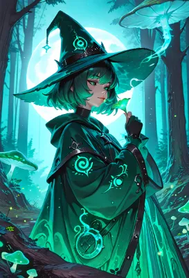 masterpiece, ultra-detailed, high resolution, 8k, premium detailed, photorealistic textures, anime forest spirit style, Ilya Kuvshinov influence (1.2), little witch in leaf-patterned witch coat (1.3), sipping cocoa with real cats (1.1), buddy ginger cat (1.1), under giant glowing mushrooms (1.2), fireflies forming constellations above (1.0), whispered stories making flowers bloom in blankets (0.9), moonlight through canopy (1.0), bioluminescent details (1.1), palette of emerald greens, soft yellows, night blues (1.0), ethereal atmosphere, serene mood, fantasy setting, magical night, premium performance, <lora:saturation:0.4>