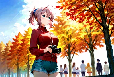 masterpiece, best quality, highly detailed CG unity 8k, illustration, Anime style, complicated, (perfect anatomy), extremely detailed 1 girl, An illustration of Shigure in Kantai Collection. (full body), looking away, extremely detailed face, smile, (kawaii:1.2), detailed eyes, large breasts. Autumn outfits, beret, (have camera), film camera, outdoor, dramatic lighting, backlighting, deep shadows.
