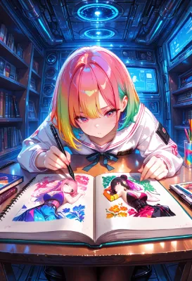未来の宇宙船のような部屋で、少女はスケッチブックに向かう。ネオンライトが揺らぐ中、彼女の筆が描き出すのは、色彩豊かな自分の分身。日常の喧騒から逃れ、想像の翼を広げる創作の瞬間。そこには、未知の冒険への憧れが込められている。彼女の瞳に映るのは、星々を越えた夢の物語か、それとも現実の延長線上にある新たな世界か。読み手は彼女の筆致に引き込まれ、自身の物語を重ねるだろう。