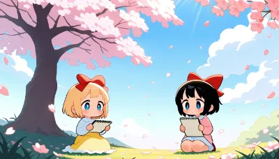 2girls,anime style,art room,sitting across from each other,holding sketchbooks,drawing pose,first girl,blond hair,short hair,bob hair,(hair bow:1.3),(red bow:1.3),blue eyes,detailed eyes,smiling gently,white blouse,pleated skirt,second girl,black hair,short hair,straight hair,brown eyes,concentrated expression,school uniform,navy cardigan,both looking at each other,wooden easels,art supplies scattered,paint tubes,brushes in containers,canvas boards,large windows,natural sunlight streaming in,art posters on walls,wooden floor,desks with art materials,peaceful atmosphere,indoor lighting,from side angle,upper body focus,hands holding pencils,sketching motion,creative mood,detailed background,school art room interior,(masterpiece:1.4),(best quality:1.4),(very aesthetic:1.3),(absurdres:1.3),