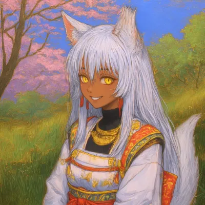 japanese anime, flat color, sunny day, transparent atmosphere, dynamical scene, beautiful japanese queen, beautiful dark-skinned girl, wild girl, white japanese miko clothes, silk clothes, black neck undershirt, white hair, fox ears, thick eyebrows, happy, looking other side, --sref 3092654157 --v 7 --profile nqxtb7h