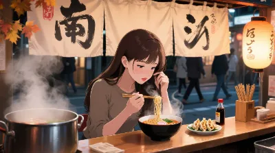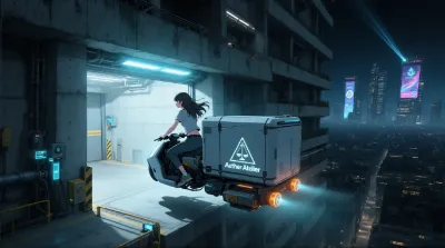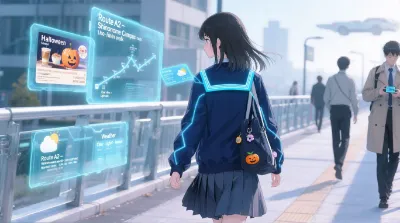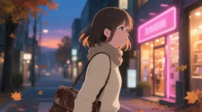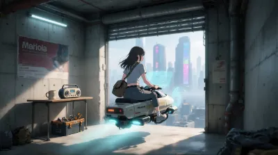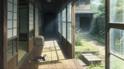 A young woman in her early twenties is sleeping naturally on a long-haired carpet in a small, narrow apartment room in a modern condominium. She wears casual summer clothes that look comfortable and light. It is early afternoon, and strong sunlight streams through the large floor-to-ceiling sliding window that is open, casting sharp and well-defined shadows only near the window area. The breeze gently moves a light curtain, emphasizing that the window is open, and creating subtle motion in the room. The sunlight reflects subtly off the desk, the stack of magazines, and the woman's hair, creating natural highlights and depth. In the room, there is a sturdy vintage-style desk with a chair in front of it. On the desk, there is a cup, a laptop, a small potted cactus, a magazine, a desk lamp that is turned off, and a smartphone. Next to the desk, there is a small stack of magazines on the floor, and another magazine is on the floor near the sleeping woman. A cushion is also placed on the floor near her. A small, simple single-seater sofa with a fabric cover in a natural color is added in the room. A storage rack filled with various items is placed against one of the walls. On the wall above the desk, there is a large poster of a tropical scene and a round clock. Through the large open window, a bright blue sky with scattered white clouds and a view of a distant cityscape is visible. In the background, a slightly dark hallway is seen with the room's entrance door partially visible. The image is in the style of a modern Japanese animated film and is designed to depict a cinematic anime scene.